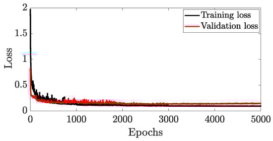Table 2 summarizes the training information for the proposed network. To train this model, the Adam algorithm was used in the MATLAB Deep Learning Toolbox. The loss function vs. iteration for the proposed deep network is given in Figure 7, where the loss functions converge to a minimal value. Additionally, the validation loss function converges to the training loss function, suggesting that neither overfitting nor underfitting has occurred [17].