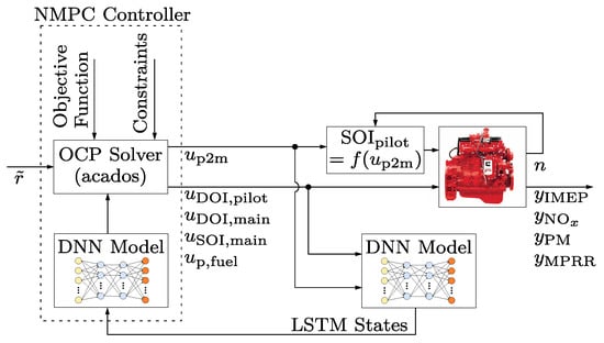 - Norouzi, A.; Shahpouri, S.; Gordon, D.; Winkler, A.; Nuss, E.; Andert, J.; Shahbakhti, M.; Koch, C.R. Integration of Deep Learning and Nonlinear Model Predictive Control in Emission reduction of Compression Ignition Combustion Engines: A Simulative Study. arXiv Preprint 2022, arXiv:2204.00139. [Google Scholar] [CrossRef]