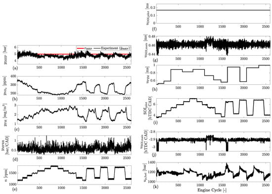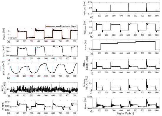 Experimental results at rpm: smooth IMEP setpoint with a bandwidth of approximately 1 Hz—(a) indicated mean effective pressure (IMEP), (b) nitrogen oxide (), (c) Particle Matter (PM), (d) maximum pressure rise rate (MPRR), (e) engine speed, (f) duration of injection (DOI) of pilot injection, (g) DOI of main injection, (h) duration between end of pilot injection and start of main injection, (i) start of injection (SOI) of pilot injection, (j) SOI of main injection, (k) fuel rail pressure.