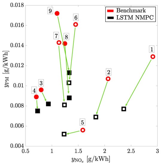 For the PM emissions, there is a significant reduction in emissions at every operating point. However, when looking at ,there is not a clear trend. At some operating points, there is an increase in emissions, while at others there is a decrease. Overall, on average, there is a slight decrease of 0.5% in emissions. However, a better comparison of the emission reduction can be seen in Figure 14, where the well-known trade-off between and PM is evaluated. Here, the importance of the cost function in the NMPC can be seen as the reduction in both and PM emissions from the upper end of their range. So, when significant PM is present, the NMPC focuses more on reducing PM and may allow a slight increase in if the value is fairly low, especially for cases 3 and 4. However, if both PM and are high, such as in cases 1 or 2, the NMPC reduces both. This is a significant advantage, as it shows that the NMPC is able to reduce both emissions when they are high and close to the upper boundary. Additionally, if one emission is comparable to the regulation boundary such as in case 9 for PM, it reduces it significantly by slightly increasing the value, which is lower than the regulated values for this engine. In this case, the well-known optimum PM and trade-off can be handled by NMPC.