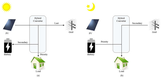 As illustrated in Figure 2a,b respectively, if PV has sufficient power to inject the required power of the load, the surplus power of PV is used to charge the battery and feed into the grid. Conversely, when PV has insufficient power, batteries and the grid have the responsibility to supply the load.