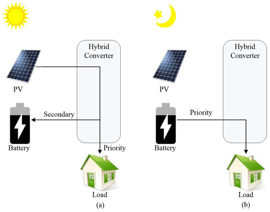 PV and battery constitute an off-grid system. If PV can supply the required power of the load, the priority is to supply the required power to the load. Any surplus power is used to charge the battery, as shown in Figure 4a. When PV has insufficient power, the battery is used to supply power to the load (Figure 4b).