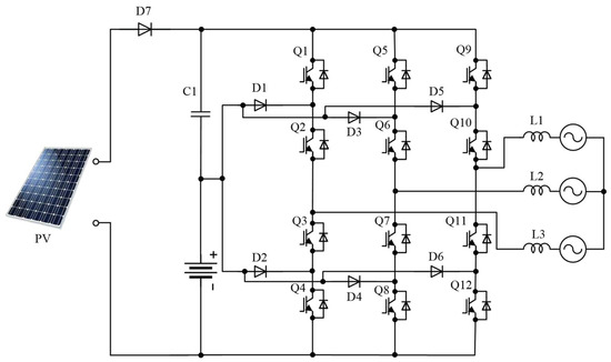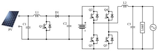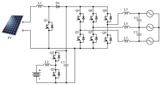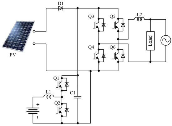 In [50], the proposed topology consists of a PV array connected directly to the dc bus, a battery with a bi-directional dc-dc converter, and a dc-ac single-phase inverter, as shown in Figure 8.