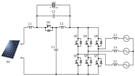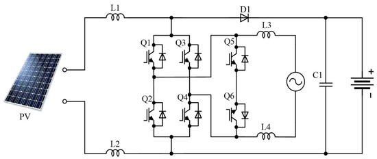 The hybrid transformerless PV converter is discussed in [65]. This system has one ac and two dc outputs. In this case, the inductor of the conventional boost converter is split into two symmetrical ones placed at the positive and negative dc rails, as shown in Figure 12. In addition, the switch of the conventional boost converter is replaced with a transformerless VSI.