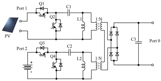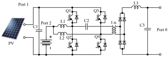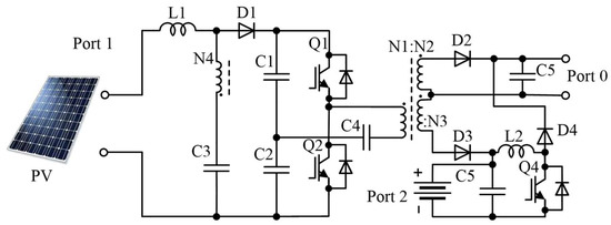 A three-port partially isolated converter is shown in Figure 14 and discussed in [73]. The PV array is connected to port 1, the battery is connected to port 2, and port 0 is the load port. This converter has three operational modes: single input, dual output mode (PV to dc bus and battery), dual input, single output mode (PV and battery to dc bus), and single input, single output mode (battery to dc bus).