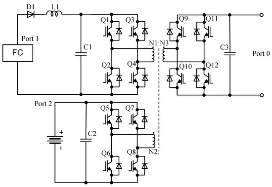 A three-port fully isolated converter is shown in Figure 15 and discussed in [73]. These modular systems have multiple modules. Each module has three ports, one fuel cell port, one energy storage port, and one load port, and all of these ports are bidirectional. The fuel cell port should be protected from reverse current, and diode D1 is used in this case for that purpose. Inductor L1 is used to mitigate current ripples. The phase shift between the active bridge interfacing port 1 and the active bridge interfacing port 0 is used to control the power flow.