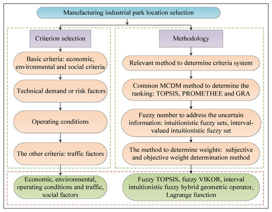Site selection mainly refers to the process of investigating, analyzing, comparing, and selecting several sites, and ultimately determining the right to use land or property to prepare for the construction of a business site according to a company’s development strategy [12,13]. The processes mentioned above require a synthetic analysis of marketing, geography, operating cost, and so forth, and then a few prospective alternative sites are analyzed on the basis of a variety of criteria. In consequence, location selection can be defined as a multi-criteria decision-making problem [14]. First of all, the selection criteria need to be determined. Second, a variety of multi-criteria decision methods are generally used in location problems to choose the optimal site, such as the Technique for Order of Preference by Similarity to Ideal Solution (TOPSIS) [15,16], VlseKriterijumska Optimizacija I Kompromisno Resenje (VIKOR) [17,18], and the preference ranking organization method for enrichment evaluations (PROMETHEE) [19,20]. Site-selection issues are widely occurring in everyday life, and it is a universally applicable method to firstly determine multiple criteria and then use the multi-criteria decision-making (MCDM) method to select the optimum site. In this paper, based on this idea, a TOPSIS and Lagrange function-based model is used for the multi-criteria manufacturing industrial park-selection problem, the criteria system is determined by literature search, and the fuzzy VIKOR method is presented to rank and select the optimal site from several alternative sites.