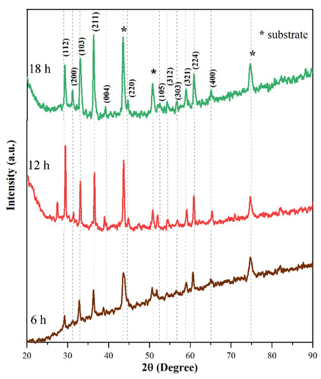 As can be seen, a small content of ZnMn2O4 is present at the lowest time (6 h). At 12 h, the intensity of the peaks increases, although there is still one more additional peak at 27.26°. No impurities are detected at the highest time (18 h). Compared to the seed layer and samples prepared with a reaction time of 12 and 6 h, the XRD peaks of the samples prepared for 18 h increased and shifted to higher angles, from 29.22° to 29.29°, 32.85° to 32.96°, and 36.33° to 36.43°, for the (112), (103), and (211) crystal planes, respectively. By changing the hydrothermal reaction time, the lattice parameters of the samples change, as illustrated in Figure 2 and attested in Table 1, resulting in a shift of the peaks in the XRD patterns. These changes in the lattice parameters are related to the defects, stress, and composition. An ideal tetragonal spinel structure with space group I41/amd was achieved for the samples produced at 18 h (Figure 2c). In the XRD spectra, a right- or left-shift diffraction can be seen. The left-side shift (lower 2-Theta) reveals the lattice relaxation, and the right-side shift (higher 2-Theta) reveals the lattice strain [25]. In this work, the strain generated in the material during synthesis caused the peak shift, showing improved crystal properties.
