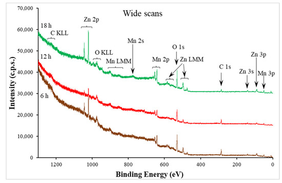 The samples were analyzed by XPS, with expected spinel compound stoichiometry ZnMn2O4. Figure 4 shows the wide spectra of all samples. Carbon, oxygen, zinc, and manganese were clearly detected. Table 3 shows the overall quantification. The experimental atomic ratios Mn/Zn included in Table 3 differ from the predicted ratios (equal to 2) for the spinel compounds stoichiometry: ZnMn2O4. Such differences result from the co-existence of several metal oxides and hydroxides identified by XPS at the surface of the coatings (as described below). The quantified oxygen includes oxygen from different sources, namely metal oxides and hydroxides, oxygen from carbonaceous moieties, and oxygen from the support. Besides the expected elements, iron from the SSM used as support is also detected in some samples. Iron is mainly in the form of Fe(III) oxide.