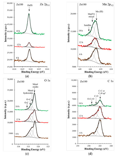 The analysis of the Mn 2p1/2 component is not included, but yields the same information as the Mn 2p3/2, but with poorer statistics, given the lower intensity. Mn 2p3/2 was fitted with a minimum of three peaks centered at 641.1 ± 0.1 eV, 642.6 ± 0.1 eV, and 644.6 ± 0.1 eV. Identifying these components is not a straightforward task, mainly due to the large dispersion of values reported for each manganese oxidation state, with ranges of BE overlapping each other [35]. However, the Mn 2p3/2 profiles shown in Figure 5 are similar to that of Mn(III) species studied by Biesinger et al. [37]. Mn(III) is the oxidation state predicted for ZnMn2O4 structures, being the relative intensity of the satellite peak, centered at higher BE, a relevant feature to distinguish Mn(II) from Mn(III). Therefore, the fitted peaks in Mn 2p3/2 spectra are assigned to (for increasing BE): Mn(III), Mn(IV) mixed with higher oxidation states [24,37], and a satellite peak. Yet, O 1 s fitted regions include two important peaks that confirm the presence of metal oxides and hydroxides, with peaks centered at 529.8 ± 0.1 eV and 531.2 ± 0.1 eV, respectively. These peaks include lattice oxygen (O2−) and hydroxyl groups in manganese, zinc oxides, and/or hydroxides. Peaks centered at higher BE in O 1 s are attributed to oxidized carbonaceous moieties, as also attested from C 1 s regions analysis. C 1 s regions were fitted with three peaks, centered at 285 ± 0.1 eV, 286.7 ± 0.1 eV, and 288.6 ± 0.1 eV, assigned to C-C and/or C-H aliphatic carbon atoms, carbon singly bonded to oxygen, and carbon in carboxylate groups (O-C=O).