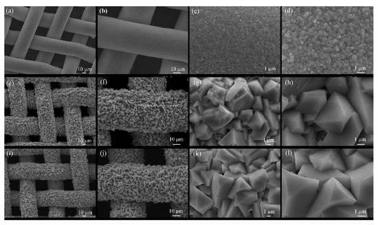 Nanopyramid ZnMn2O4 spinel samples were deposited directly on a stainless steel mesh (SSM, Bolin Metal Wire Mesh Co., Ltd., Hengshui, China) by hydrothermal processes. These SSM substrates (with a wire diameter of 35 μm and a screen opening of 45 μm) were cut into a rectangular shape (2 cm × 5 cm), immersed in 10−3 M hydrochloric acid (HCl, ≥37 wt.%) for a few seconds, then successively cleaned with acetone and ethanol for 10 min using an ultrasonic cleaner, and finally rinsed with distilled water. In this experiment, an aqueous solution containing 0.075 M of zinc acetate dihydrate (Zn(CH3COO)2.2H2O, ≥98 wt.%) and 0.15 M manganese acetate tetrahydrate (Mn(CH3COO)2.4H2O, ≥99 wt.%) was prepared by dissolving these chemicals (in a 1:2 molar ratio) in 20 mL distilled water under magnetic stirring at 800 rpm for 30 min. Then, 5 M sodium hydroxide (NaOH, ≥98 wt.%) was added dropwise to the previous solution until reaching pH = 10. The reaction system was transferred to a Teflon-coated stainless steel autoclave. Depending on the experiment, a piece of SSM was placed in the autoclave and held at 180 °C for 6 h, 12 h, or 18 h. The coated mesh was carefully removed from the container and washed with distilled water. After drying, the mesh was annealed at 400 °C for 2 h and used as a supercapacitor electrode. Unless otherwise stated, all used chemicals were acquired from Sigma-Aldrich (St. Louis, MO, USA).