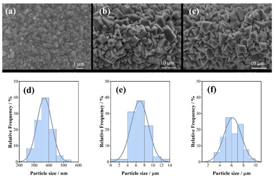 SEM micrographs and particle size distribution of ZnMn2O4 spinel prepared for (a,d) 6 h, (b,e) 12 h, and (c,f) 18 h.