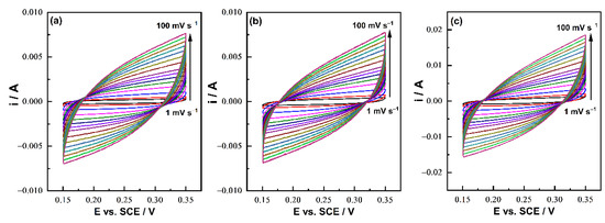 The specific capacitance, Cs, value is determined according to the inner area of the CV curves at various scan rates (Equation (4)) [44],