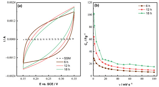 Figure 10a compares the cyclic voltammograms of the produced materials and bare SSM substrate at a scan rate of 10 mV s−1 [43]. The curve for the sample treated for 18 h presents the largest area. For lower time (12 h and 6 h), the CV area declined dramatically and was almost null for the bare substrate, revealing reduced charge–storage capacity. However, large areas demonstrate good contact between the electrode’s surface and the electrolyte [34].