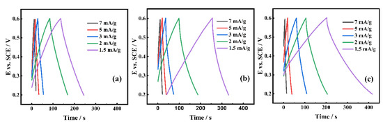 Figure 11 shows the variation of galvanostatic charge–discharge (GCD) cycling of the spinel samples over the 0.2–0.6 V potential range at specific currents of 7, 5, 3, 2, and 1.5 mA g−1. The ZnMn2O4 electrode treated for 18 h (Figure 11c) clearly shows a greater discharge time rate than the samples produced at 6 h and 12 h (Figure 11a,b, respectively). Due to the electrochemical double-layer capacitor feature, all the samples showed linear variation in the charge–discharge curves [33].