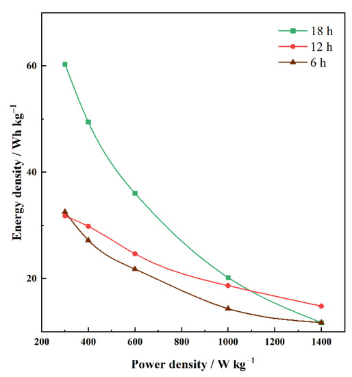 Ragone plots (E vs. P) of ZnMn2O4 spinel produced for 6 h (brown), 12 h (red), and 18 h (green).