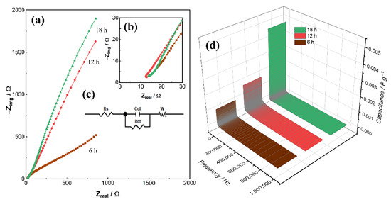 where f is the frequency (Hz) and Zimg is the imaginary impedance (Ω). The results for each sample are presented in Figure 13d. The reaction time affects the Cdl, with the highest capacitance value exhibited for 18 h.