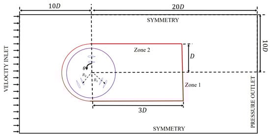 An H-grid method with a rectangular computational domain was used in this study, shown in Figure 2. A uniform flow-velocity was prescribed at the inlet boundary located at a distance of from the central axis of the turbine. Gauge pressure was set as zero on the pressure outlet boundary located away from this axis. Top and bottom boundaries were set as symmetry, and each one was located at a distance of from the center of the turbine. All domain boundaries were adjusted following the recommendations of Rezaeiha et al. [40]. The main objective of performing sensitivity studies on domain-size independence is to ensure accuracy in capturing the physical phenomena around rotating blades and computing their performance parameters. Rezaeiha et al. [40] concluded through extensive and simulations that inlet, outlet, and side boundaries should be kept at a minimum distance of from the center of the turbine to minimize their impact on numerical accuracy, let the wake fully resolve, and avoid blockage effects.