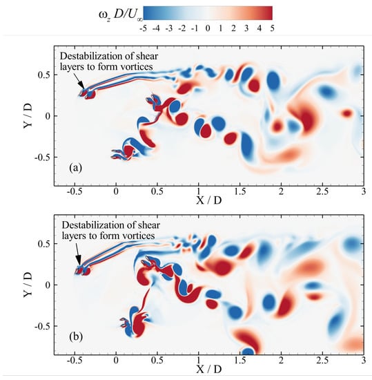 For , the turbine undergoes rapid acceleration, and we see an overshoot in the torque profile (see Figure 7a). Now, the wake is clearly bounded by two vortex streets with negative and positive vortices traversing on the windward and leeward sides, respectively, as presented in Figure 10e. Vortices in the middle are not strong with smaller length scales and quickly diffuse, which means that convection of secondary coherent flow structures is suppressed by the turbine in order to reach its steady-state. The primary reason for the disappearance of flow activity from the middle of the wake is the entrapment of vortices between the rotating blades with high angular velocities on the windward side. As the turbine approaches its steady-state rotation, blades stop producing distinct vortices during their entire rotation cycle. Thus, distinct shear layers are formed and maintained, which is due to the blades experiencing angles-of-attack lower than their stall angles such that they do not undergo dynamic stall in this operational phase with increasing speed of the turbine. Stabilization of these shear layers then causes the production of helical vortices in three-dimensional flows around rotating machines [47]. In this stage of their flow-induced rotation, the shear layers of blades are only destabilized when the blades pass through the regions of entrapped vorticity on windward and leeward sides. Due to this phenomenon, more distinct coherent structures are shed on the windward side and an elongated shear layer of positive vorticity is seen to traverse in the downstream direction on the leeward side. It means that entrapment of vorticity by the rotating blades plays an important role in setting up flow dynamics in the wake to a steady-state and help the turbine attain its final . Although the wake is clearly asymmetric in this state, it resembles a classical von Karman vortex street behind an oscillating/rotating cylinder [48,49]. We observe similar flow phenomena for the whole range of considered in this study. However, three important phenomena occur with increasing : (1) the region of entrapment for vortices expands between the rotating blades, (2) the vortices shed by the turbines on windward and leeward sides become stronger and bigger in size, and (3) the turbines are able to attain their steady-state operational phase in less time.