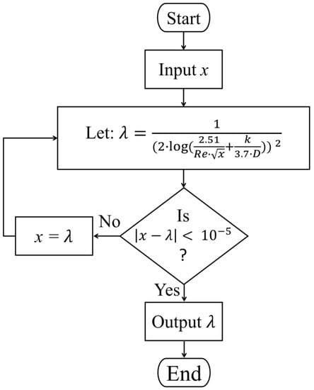 Since the gas flow in pipelines is turbulent, which can be verified by plugging the corresponding values from Table 1 into Equation (2), the Colebrook–White equation [40] can be used: