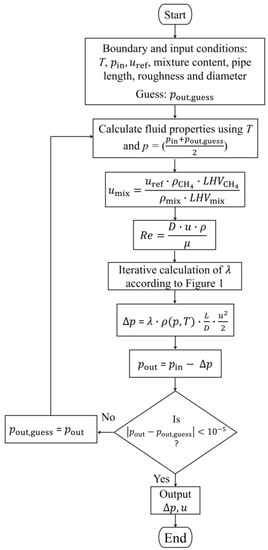 with as the mean velocity of the 100% NG reference case. The pressure loss can be calculated using Equation (1). Since the outlet pressure is required for the calculation of the fluid properties, an iterative approach according to the flow chart in Figure 2 is required. Furthermore, since the density is a non-linear function of pressure, the pressure drop over longer distances is also not linear. Therefore, for the calculation of the pressure drop, the total pipe length is discretized 1D into multiple shorter segments. The approach depicted in Figure 2 is used for each length segment, with the outlet pressure of the i-th segment used as the inlet pressure of the subsequent i+1-th segment: .