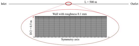 To verify the accuracy of the 1D pressure drop model in MATLAB in comparison to results obtained by solving the complete set of Navier–Stokes equations and turbulence models, the results from the 1D model were compared and validated using a 2D CFD simulation model in the commercial software ANSYS Fluent [48]. The axis-symmetric geometry of a straight pipe segment with a length of 500 m was modeled and meshed, see Figure 3.