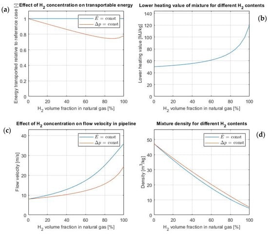 The characteristic of the profile of Ė can be revealed by further analysis of its equation (Equation (15)). The lower heating value and density ρ of the blend decrease linearly with the volumetric fraction of H2. The function of the flow velocity (Figure 4c, Δp = const.) in terms of the H2 volume fraction is non-linear. Higher H2 content leads to disproportionately higher velocities. Up to approx. 90% of the H2 volume fraction, the increasing velocity cannot compensate for the decreasing values of and ρ (the first total derivative of Equation (14) with respect to the H2 volume fraction is negative). At volume fractions above 90%, the high positive velocity gradient leads to an increase in Ė.