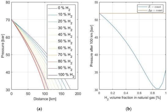 Compression should occur after a pressure drop of approx. 50% for the compressor to be able to operate at a favorable pressure ratio. With the chosen boundary and framework conditions (Table 2), pure NG has to be re-compressed after a distance of approx. 165 km. In contrast, H2 has to be compressed after approx. 100 km. Currently used radial compressors tolerate an H2 share of up to 40% [49]. In order to be able to transport the same amount of energy, compression must take place after approximately 150 km at a 40% H2 share. Current guidelines of the ÖVGW in Austria and the DVGW in Germany allow a H2 share of 10% [50]. In this case, the pressure level would drop from the current 35 bar to approximately 32 bar upon arrival at the compressor station. This calculated pressure difference can be classified as unproblematic.