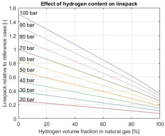 Furthermore, due to hydrogen having a smaller density than NG, the linepack at 100% H2 decreases by 70% relative to the reference case. Even if the pressure is increased up to 100 bar, the storage capacity with 100% H2 is below 40% relative to the reference case. This leads to the need for off-grid storage options in order to be able to compensate for failures or fluctuations.