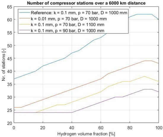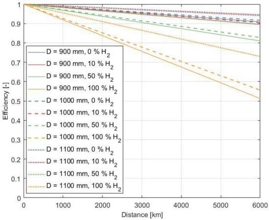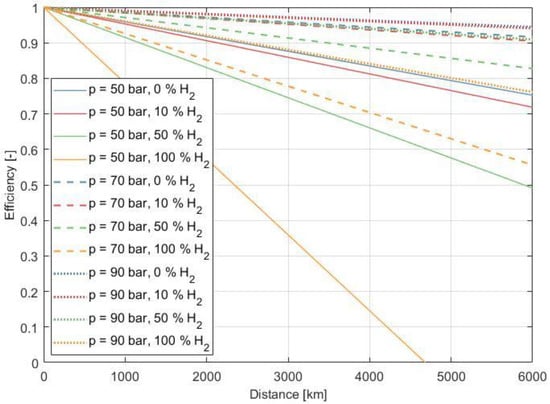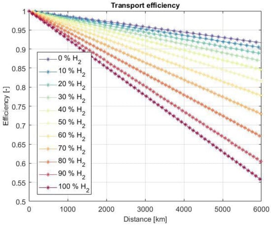 The results show that transporting the same energy content as the benchmark case (100% NG) is possible from a technical standpoint, even at 100% H2. However, mixtures with higher hydrogen content require additional compressor stations at shorter distance intervals as well as increased compressor power per station. For pure hydrogen, the compressor power per station is greater by a factor of 2–3 compared to the reference case for the same compression ratio, while the required distance between compressor stations decreases by 33%. This leads to a significant decrease in transport efficiency of up to 37%, over long distances up to 6000 km. However, for lower hydrogen contents up to 30%, the decrease in transport efficiency is below 7%, while the compressor power is greater by a manageable factor of ~1.5.