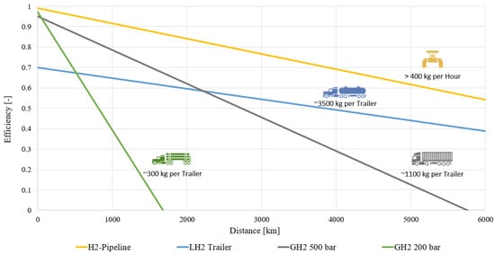 The scenarios analysed above compare the transport efficiencies of different H2-NG mixtures. In this sub-chapter, the efficiency of different transport technologies for the distribution of pure H2 are compared. In [54] the transport efficiencies of different distribution options are initially compared and discussed. These considerations shall now be expanded with the findings from this work. The following means of on-land transportation will be considered: GH2 200 bar trailer ( = 300 kg H2 loading capacity), GH2 500 bar trailer ( = 1100 kg H2), liquid hydrogen trailer (= 3500 kg H2) and pipeline transport. For the pipeline transport efficiency, the curve according to Figure 8 at 100% H2 is selected. The transport efficiency as a function of the distance for the transport by trailer can be calculated as follows:
