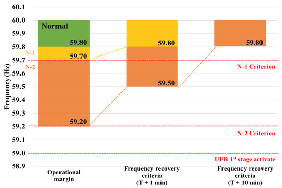 Moreover, the power system maintains frequency without load disconnection. Therefore, the power system is required to maintain a frequency within the allowable range. In the case of the Korean power system, the frequency must be above 59.70 Hz even when the single generator trips, in accordance with the frequency operation criteria, as shown in Figure 1. Load shedding is sequentially conducted when the frequency decreases below 59.0 Hz.