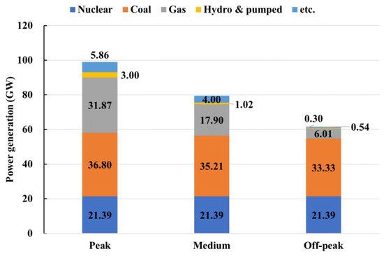 As of 2021, the peak load of the Korean power system was 91.141 GW, and the off-peak load was 54.836 GW. Compared to 2021, in 2030, peak and off-peak demand are expected to increase by 8.53% and 12.28%, respectively. In Korea, nuclear and coal-fired generators have been supplying electricity as base power sources. Accordingly, the power supply of the gas generator changes according to the demand. In the case of the plan DB, VER was not included as a separate review item; therefore, it was reflected based on additional modeling. Considering the expansion plan, the ratio of PV to WTG was applied as 2:1 for the installed capacity of VER. Typically, in the case of a medium-load level for a solar-based power system, such as the Korean power system, VER would account for the high portion of generation.