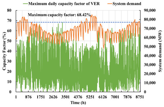According to the evaluation procedure, it is necessary to determine a penetration limit of VER. In Korea, the aim is to expand the capacity of VER to 51.20 GW by 2030 according to the expansion plan for VER; therefore, the power system needs to analyze whether this target is attainable. As a reference for this analysis, historical data on the power output of VER in the Korean power system were analyzed first. The analysis used the operational data from the 2.21 GW of VER capacity that penetrated the Korean power system for one year in 2017, as shown in Figure 6 [40].