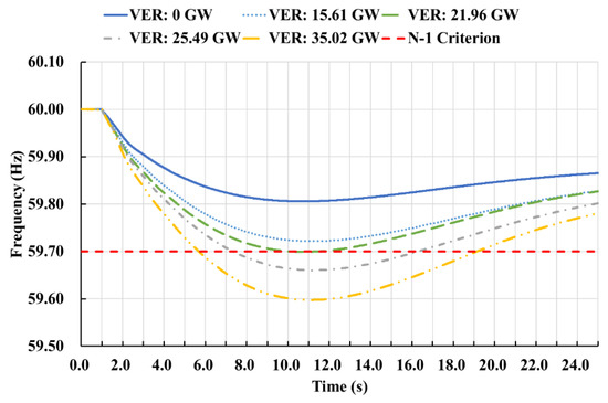 Based on this, the penetration limit of VER was analyzed according to the first step of the evaluation procedure. Figure 7 shows frequency characteristics in the medium-load, derived under the same frequency reserve and N-1 disturbance, by increasing the penetration level of VER.