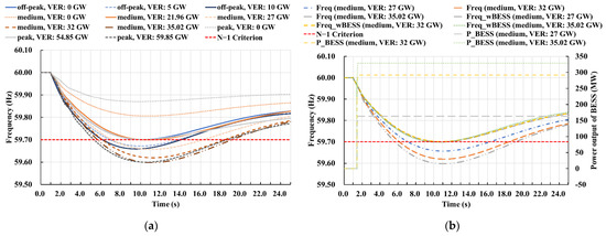 For the off-peak load, the nadir frequency reached 59.70 Hz when the N-1 contingency of the power system occurred without VER. Thus, a condition occurred where it was impossible to accommodate additional VER. For medium load, the penetration limit of VER corresponded to 21.96 GW. Furthermore, for peak load, it can be confirmed that the power system could be operated within the frequency criteria even when the VER penetrated as much as 54.85 GW, as shown in Figure 9a.