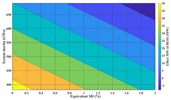 Depending on the inertia of the power system and the sensitivity of the frequency response provided by the BESS, the effect of BESS on the penetration limit of VER can be derived in proportional form. In Figure 12, lighter colors indicate a high effect of increasing the penetration limit of VER, and conversely, darker colors indicate that it is lowered. Combining the above results, the lower the inertia of the power system and the more sensitive the response performance of the BESS, the higher the effective MW can be achieved with the same facility investment of BESS. Therefore, it is necessary to manage the operating condition of BESS to quantitatively and stably manage the penetration of the targeted VER capacity by the power system.