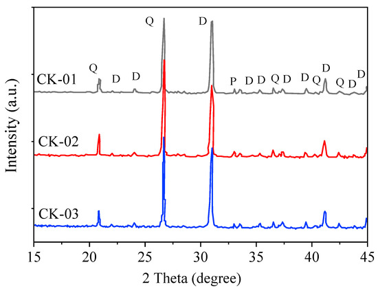 The rock blocks with a relatively consistent lithology were selected to reduce the sample differences. The composition analysis was performed on three black dolomite samples: CK-01, CK-02, and CK-03. The X-ray diffraction (XRD) results are shown in Figure 1, and the mineral compositions are demonstrated in Table 1. The black sandy dolomite contained 31.70–36.80% of quartz, dolomite (46.60–52.40%), a small amount of pyrite (3.60–5.30%), plagioclase layers (1.60–2.90%), a mixed-layer of illite/smectite (4.50–6.40%), and trace amounts of illite (1.90–3.60%), kaolinite (0.3–0.46%) and chlorite (0.36–0.59%).