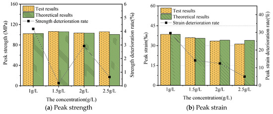 The aqueous chemical solution had a strong softening effect, generating strain softening in the samples. The softening effect of the chemical solution increased the peak strain of the samples. Moreover, the elastic modulus could reflect the softening effect of the chemical solution on the samples, as the curve slopes changed obviously in the prepeak stage. As shown in Figure 3, for the Fe3+ concentrations of 1.0, 1.5, 2.0, and 2.5 g/L, the peak strength of the samples decreased by 4.18%, 0.19%, 2.93%, and 0.64% when compared with the nonsoaked sample, respectively. Meanwhile, their peak strain increased by 29.58%, 14.11%, 12.42%, and 4.96%, respectively. This showed that the corrosion effect of different concentrations of the soaking solution on the samples was different. Iron ions formed a film on the sample surfaces to inhibit the sample, which inhibited the reaction. The corrosion effect and deterioration degree decreased with concentration [46,47].