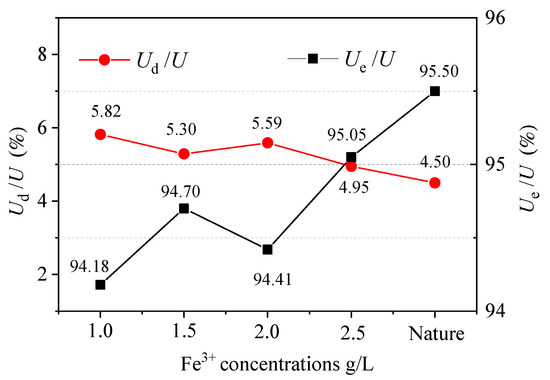 After chemical etching with the solution concentration, the peak of the strain energy value was less, suggesting that the soaking process by dissolution increased the internal damage of the sample. With the corrosion effect, the internal damage became more severe and more likely to cause new damage. At the same time, the internal part of the rock minerals affected by the chemical changes reduced the brittleness of the samples [53,54,55]. From Figure 4 and Table 4, the concentration decreased the total energy, U, and the value of Ud/U. The energy storage form of the sample did not fundamentally change after corrosion by the aqueous chemical solution. The absorbed energy was mainly stored as the releasable elastic strain energy, Ue, in the sample. The solution concentration had a significant influence on the strain energy of the samples. The transformation rate of Ud/U was faster than that of Ue/U. This transformation trend was gradually strengthened with the load.