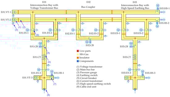 The simplified structure of GIS is shown in Figure 1 as a double busbar arrangement. In practice, the major components are clearly categorized from the GIS single line diagram and bus structure plan. Primary components include circuit breaker (CB), earthing switch (ES), disconnecting switch (DS), high-speed earthing switch (HS), current transformer (CT) and voltage transformer (VT). The secondary components are grouped into local control cabinet (LCC), gas compartment (COMPT) and body housing.