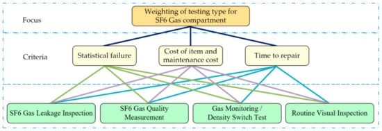 To determine the relative strength and pairwise comparisons, the model is separated into three layers consisting of focusing heading, decision criteria, and alternative field-testing types. The process of AHP was applied step by step to brainstorm the opinion of experts working in various departments related to GIS in a utility. The utility experts who have been invited to share their opinions consist of: maintenance engineers with long-time experiences in testing and inspection; engineers in electrical engineering departments who have knowledge in planning, design, and system configuration; and lastly, plant managers who decide on system operation, reliability, and other aspects. The pairwise comparison module has been developed in the Microsoft Excel program and distributed to all invited experts to freely share their opinions. Next, the obtained weighting values are averaged by using the geometric mean method and finally normalized to one hundred percent in total.