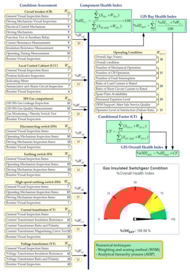 To calculate the percentage component health index (%HIc), the score is defined by the condition of each asset, which is defined as 0 for poor condition, 3 for satisfactory condition, and 5 for normal condition. The %HIc is then further used to calculate the percentage bay health index (%HIBAY) by using the obtained %HIc and the related weight of those major components. Additionally, the WSM is applied to calculate the conditional factor score of each GIS bay, which is further used to modify the percentage overall health index (%OHI) of the GIS.