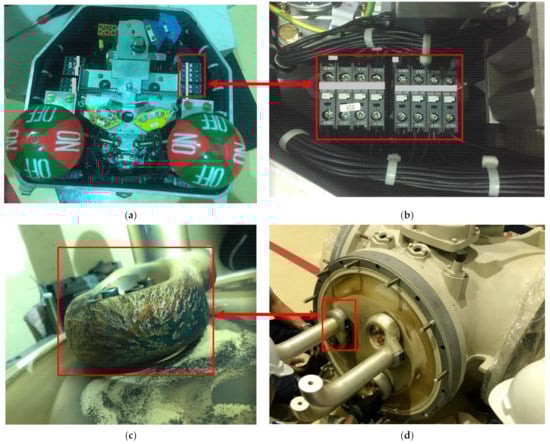 Sample of GIS failure components: (a) E02-DS ‘s auxiliary magnetic relay malfunction; (b) E02-new auxiliary magnetic relay; (c) E05-busbar electrical discharge; (d) E05-new busbar replacement.