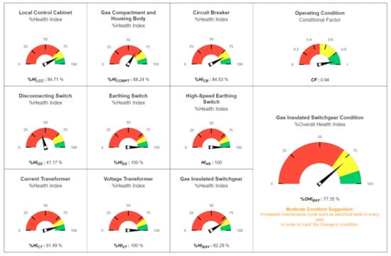 The development of a condition assessment procedure is an essential part to process the required data and to deliver the valuable output to optimize the maintenance task in the organization, and to define the proper maintenance strategy [,,,]. The objective of this work is to develop a decision support tool to use in a power producer grid in an industrial estate. The condition assessment procedure illustrates the actual condition of all major components in a GIS bay via the visible aging obtained from the field testing and inspection along with the actual operating data, and incorporates the invisible aging obtained from the CF.