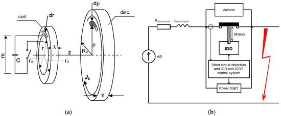 (a) Inductive–dynamic drive (IDD); (b) block diagram of hybrid circuit breaker. Where rw, rz, λ, Rz, h—coil and disc dimensions; Js—eddy current density; C, E—capacitance and initial voltage.
