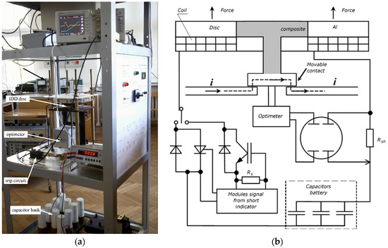 In order to verify the models of electrodynamic actuators, the authors designed and built a new measuring system that allows direct registration of the coil current and displacement of the disc [36,37]. In relation to the previously used measurement system [18] the goal of the new one was, among other features, to minimize the external vibrations of the system that could introduce additional disturbances both in the course of the disc motion and in the measurement sensors (Figure 2). An additional connector based on the IGBT transistor (previously a thyristor) was constructed to increase the dynamic state of the transient in the capacitor discharging system (Figure 2b). The registration of the coil current, similarly as in the previous system, was based on a measuring shunt characterized by a very low inductance necessary to register currents whose rise steepness may exceed 5 kA/μs. Therefore, a new bifilar resistive sensor was used.