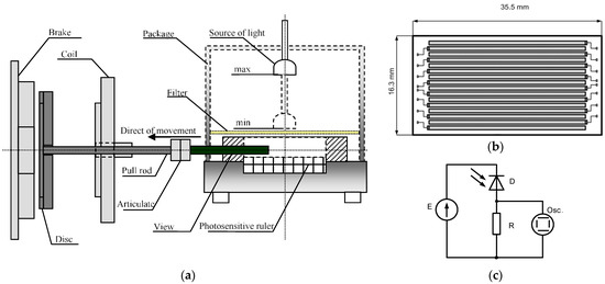 Photoelement (a) view of construction, (b) matrix structure of photosensitive ruler, and (c) photodiode system.