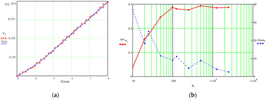 (a) The output characteristic of the optical sensor (measurement and approximation); (b) the mean square error and the relative error in function (kr = n) of the number of measuring points taken into account.