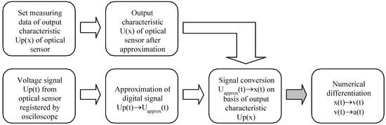 As a consequence of the authors’ experiences, the choice of both the polynomial degree and a sufficient number of measurement points of the static output characteristic was made on the basis of observations of the determined runs of the medium standard deviation and the maximum relative error. As a result of these tests, it was considered that the sixth degree polynomial using the Gram function is sufficient and the number of measurement points should not be fewer than 50 (Figure 5). The authors developed the approximation procedures using the Gram function in the Mathcad environment [36]. The flow chart for determining the filtered characteristic of displacement allowing for obtaining smooth velocity and acceleration functions of the disc is shown in Figure 6. In the first stage, the measurement points of the static characteristic of the optical sensor (Up(x)—voltage in the displacement function for at least 50 points) are determined, and as a next step this characteristic is approximated. Then, the dynamic movement of the disc (Up(t)—voltage as a function of time) is recorded, which is also approximated. Then, the filtered Uapprox voltage function is converted to the actual displacement waveform as a function of time.